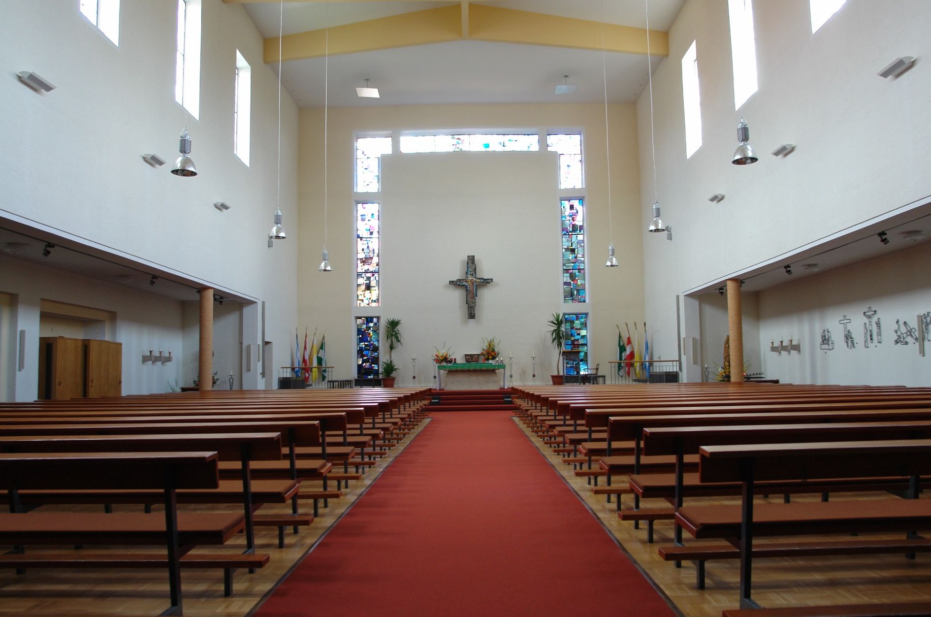 Was dem Beschauer des entstandenen Kirchenbaues nicht sichtbar ward, sind die Planungen, Gespräche, Reisen und Überlegungen, die der Innenausstattung dienten. Überrascht waren heute die Gläubigen und Gäste beim Betreten des Gotteshauses über seine eindrucksvolle schlichte Schönheit, das Sonnenfarbenspiel der Buntfenster an den hellen Wänden, das über den leicht gelblich warmen Stein des Altares hinhuscht und zur Ostwand mit dem Tabernakel in Kupfer führten. Der Blick wird von dem Ort gefangen, der dem lebendigen Gott zur Wohnstatt bereitet wurde und wird doch auch von der rechten Längsseite angezogen, der den Leidensweg des Herrn in schöner Drahtplastik trägt, zum verweilenden Betrachten einlädt. Links aber im Seitengang in der Mitte in kleinerer Nische mahnt der achteckige Taufstein aus dem gleichen Marmor wie den Altar an der Beginn des Christseins, daneben links und rechts Beichtstühle in der Wand eingebaut, die das Geheimnis des Sakramentes im Schweigen und Verzeihen und neuer Begnadigung bergen. In den Seitenwänden je sechs Apostelkreuze mit Messingschalen führen den Blick wieder zum Altarraum.